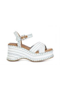 Sandali con incrocio etnico. zeppa fasciata sempre in tessuto etnico. il comodo soletto in vera pelle fa risultare la calzatura comoda anche dopo svariate ore di utilizzo. il tacco è alto 8 cm il plateau invece è di 4 cm.