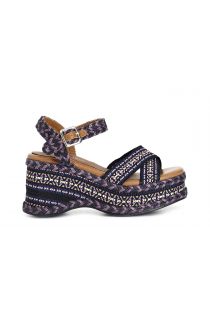 Sandali con incrocio etnico. zeppa fasciata sempre in tessuto etnico. il comodo soletto in vera pelle fa risultare la calzatura comoda anche dopo svariate ore di utilizzo. il tacco è alto 8 cm il plateau invece è di 4 cm.
