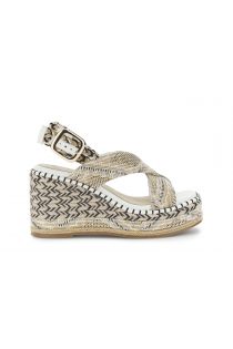 Sandali con incrocio in tessuto su zeppa fasciata di 9.5 cm. cinturino intrecciato e sottopiede comfort. calzature ideali per l’estate dallo tile boho-chic e massima stabilità per look freschi e trendy.