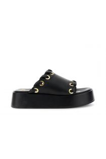 Sandali modello ciabatta in nappa con maxi occhielli e infilatura intrecciata. fodera e soletto in pelle per comfort quotidiano. suola alta 5 cm per uno stile moderno e grintoso. calzatura perfetta per look estivi trendy.