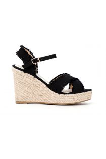 Zeppa fasciata in corda con plateaux, soletto in pelle, e fasce realizzate in tessuto sfrangiato