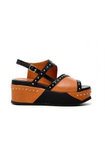 sandalo asimmetrico in pelle con profili a contrasto e borchiette zeppa media