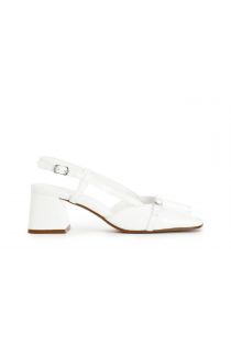 scarpe aperte dietro in vernice con bordo e cinturino bianco