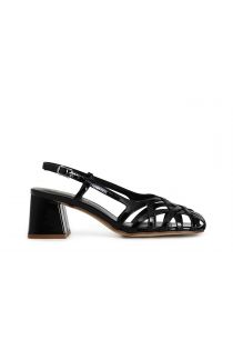 Scarpe aperte in vernice con gabbia asimmetrica intrecciata. calzatura dalla forma arrotondata. laccio sul dietro. tacco alto 45mm. molto comoda perfetta per l'uso quotidiano.