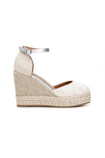 Scarpe con laccio alla caviglia in tessuto effetto pizzo su zeppa corda h90mm