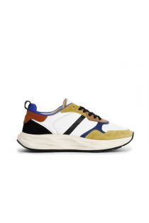 Scarpe running uomo multicolor in pelle e tessuto con nuova suola caratterizzata da un gioco di scavature che rendono la calzatura unica nel suo genere.