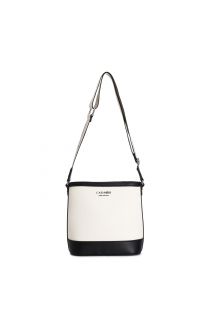 Secchiello in canvas naturale profili a contrasto. loghi in materiale plastico e tracolla a nastro regolabile. tasca posteriore aperta e rivetti logati smaltati.