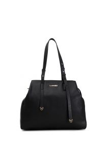 Ampia shopping bag capiente arricchita dalla possibilità di aprire e chiudere con moschettone la parte superiore della borsa facendole mutare forma. I manici con decorazione effetto fibbia