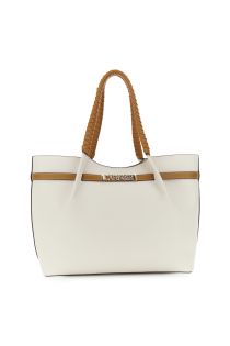 shopping bag con pieghe effetto pelle con grana e rifiniture in similpelle panna/cuoio