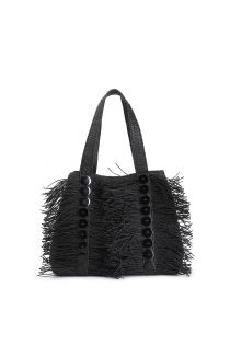 Shopping bag in rafia con dettagli in frange e bottoni decorativi. design ampio e pratico perfetto per aggiungere un tocco originale ai tuoi outfit estivi.