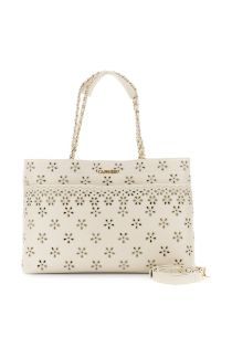 Shopping bag morbida effetto nappa con elegante ricamo sangallo all over. dotata di tasca frontale e manici con catena dorata è la borsa capiente ideale per look femminili estivi e ricercati. dimensioni: non disponibili