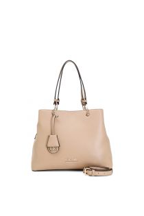 Shopping con portabilità a spalla. agganci manici ovali in metallo e ciondolo pendente con accessorio cafènoir. borsa divisa in vari scompartimenti: una tramezza chiusa con zip e due tasche laterali.