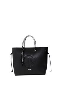 Particolare shopping bag realizzata in simil pelle con nuovo monogramma CN ricamato e manico di corda bicolor che lascia fuoriuscire una simpatica frangia asimmetrica. Coulisse laterale in tinta.
