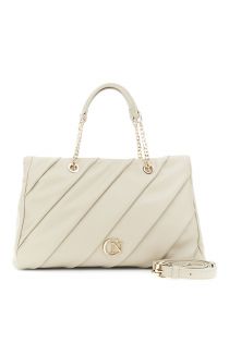 Shopping in similpelle con plissettatura frontale tasca con zip sul retro e tramezza interna. manici imbottiti con catena logo cafènoir in metallo e tracolla removibile.