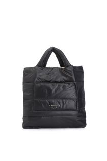 Shopping in nylon reversibile imbottito con un lato tinta unita e tasca applicata e un lato stampato con scritta "be noir" logo in gomma.