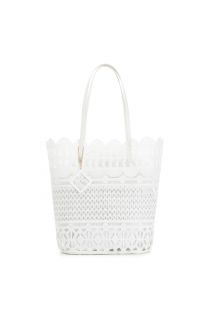 Shopping in pizzo con sacchetto interno in cotone. manici effetto pelle e ciondolo tono su tono. perfetta per colorare ogni look estivo.