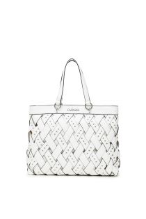 Shopping bag intrecciata con piccoli dettagli borchiati che ricordano un'impuntura.