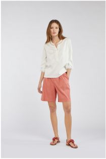 Shorts ampi, pratici e confortevoli, realizzati in un particolare tessuto tecnico tinto in capo. Ricamo elasticato nel cinturino per permetter un maggiore comfort e piccole pinces in vita che creano un delicato volume in corrispondenza delle tasche.