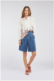 Shorts in morbida tela chambray con applicazione di canottiglie alle tasche che donano un tocco di brio. Piccole pinces in vita che creano un delicato volume in corrispondenza delle tasche.