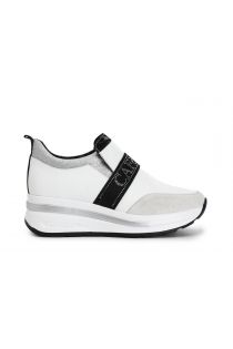 Slip-on da donna in pelle arricchita da dettagli glitterati e graziosa fascia con logo cafènoir in strass. suola rialzata bicolor con logo embossed.