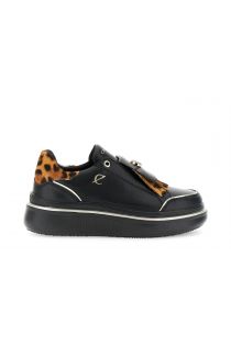 Slip-on in pelle con dettaglio frange in pelle effetto cavallino maculato. e accessorio gioiello. logo laterale con monogramma cafènoir.fodera in tessuto sottopiede in pelle. suola platform 4 cm per uno stile glam e comodo.
