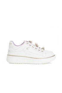 Sneakers da donna allacciata in pelle rivestita con plateau 3 cm. calzatura con particolare accessorio removibile sui lacci. punta tonda. fussbett interno. suola alta 4.5 cm. perfette per che vuole abbinare comodità e distinguersi in ogni occasione della giornata.