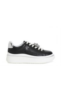 Sneakers da donna allacciata in pelle rivestita con plateau 3 cm. calzatura con particolare accessorio removibile sui lacci. punta tonda. fussbett interno. suola alta 4.5 cm. perfette per che vuole abbinare comodità e distinguersi in ogni occasione della giornata.