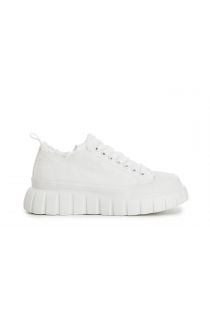 Sneakers allacciate in tessuto sfrangiato suola rialzata decorata da un pattern rigato. modello contraddistinto da una punta in gomma che decora la calzatura.