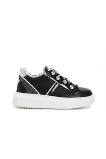Sneakers alte in pelle con inserti glitterati e laminati. Maxi strass decorano l'allacciatura. Suola running snella e lineare a cassetta con logo metallico sul lato esterno