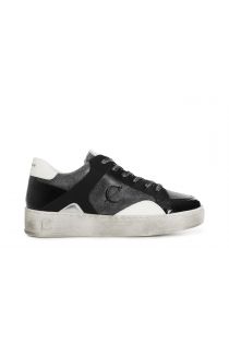 Sneakers da donna in pelle e pelle scamosciata con riporti effetto vernice e metallico. logo embossed laterale con monoframma cafènoir. calzatura dalla forma stondata. chiusura con lacci. fussbett interno. suola a cassetta 30mm.