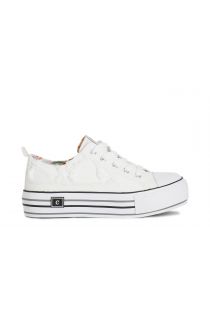 Sneakers in tessuto con inserto sfrangiato.punta in gomma. chiusura con lacci. suola a cassetta da 4 cm con dettagli colorati. calzatura che si presta facilmente abbinabile a tutti i look.