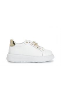 Sneakers in pelle da donna arricchita da un meraviglioso accessorio gioiello removibile posto sull'acciatura che rende la calzatura davvero unica e decisamente glamour. suola a cassetta e soletto in pelle.