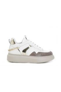 Sneakers in pelle con catena decorativa sul tallone e tomaia arricchita da inserti in pelle scamosciata e laminata. Suola a cassetta total white.