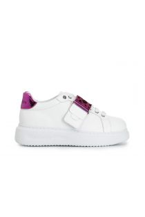 Sneakers in pelle con riporti laminati e dettaglio fascia in cavallino sul davanti della calzatura. la suola è a cassetta e il soletto è in pelle.
