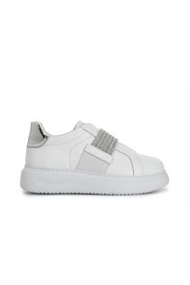Sneakers in pelle con inserti glitterati e laminati. microfasce elastiche in strass arricchiscono e impreziosiscono la calzatura ed agevolano la calzata. la suola è a cassetta e il soletto è in pelle.