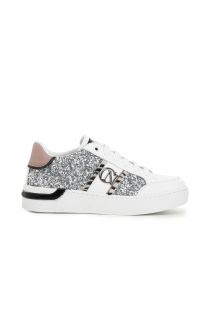 Sneakers in pelle con inserti glitterati. Logo metallico laterale con fondo a cassetta ed inserto metallizzato.