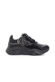 Sneakers in pelle con inserti in laminato, grande accessorio metallico che arricchisce la tomaia. Suola running