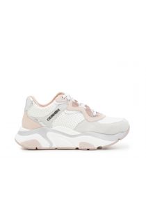 Sneakers in pelle e raso con inserti colorati sulla suola che riprendono i colori della tomaia. Logo laterale e una leggera trama a micro pois decorano l'insieme