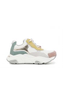 Sneakers con inserti in glitter argento sulla suola. La tomaia è in pelle scamosciata multicolor e nylon. La catena multicolor personalizzata con logo cafènoir partecipa all'allacciatura ed è removibile.