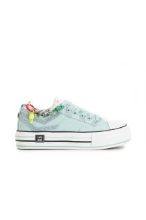 Sneakers in tessuto con dettagli glitterati sul retro e accessorio con catena e dettagli colorati in dotazione. suola a cassetta con righe decorative.