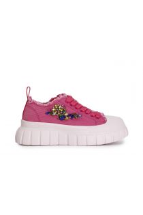 sneakers in tessuto sfrangiato e patch di strass fuxia