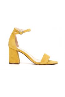 Sandali in pelle scamosciata con cinturino alla caviglia e toppone sul tallone. Fascia frontale e tacco squadrato.