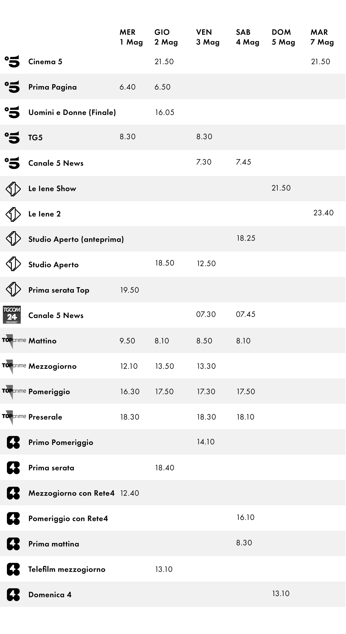 Programmi di grande audience come Uomini e Donne, Le Iene Show, Tgcom e film in prima serata.