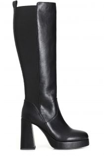 Stivale alto stretch in similpelle con elastico sul retro. plateau di 22 mm e tacco alto 100 mm. forma stondata. il soletto è in pelle. il tutto dona equilibrio tra altezza bellezza e comodità.