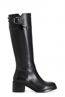 Stivale donna in pelle arricchito da una fibbia a decoro e da un motivo di borchie sul gambale. il tacco è alto 50mm. il soletto è in pelle.