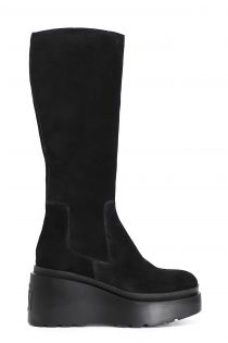 Stivale in pelle scamosciata con pleteau e tacco. soletto in pelle e suola con zeppa personalizzata con logo a rilievo sul retro.