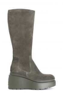 Stivale in pelle scamosciata con pleteau e tacco. soletto in pelle e suola con zeppa personalizzata con logo a rilievo sul retro.