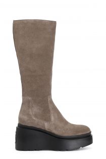 Stivale in pelle scamosciata con pleteau e tacco. soletto in pelle e suola con zeppa personalizzata con logo a rilievo sul retro.