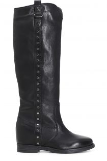 Stivali alti in pelle con borchie laterali e zeppa interna. Un gioco di impunture crea armonia e dinamicità.