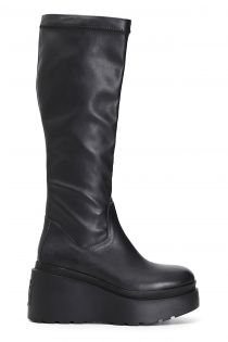 Stivali con gambale stretch che calzano come una seconda pelle. Suola con zeppa personalizzata dal logo in rilievo